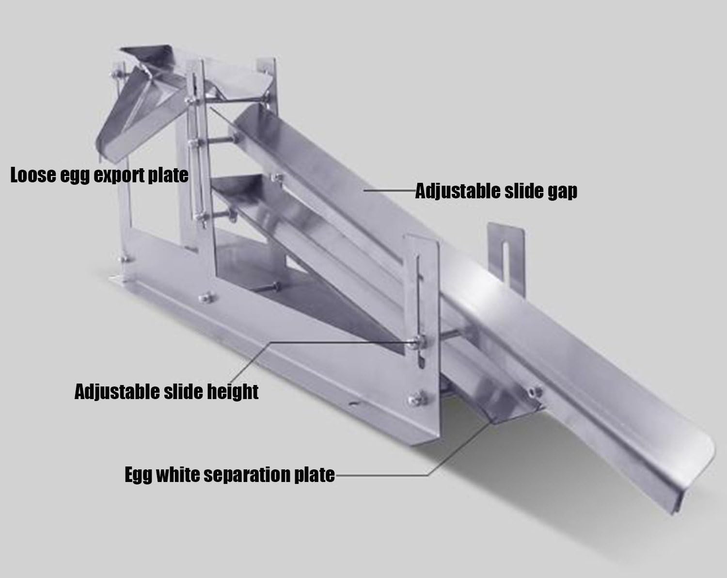 Introducing the Commercial Egg White and Yolk Separator, a robust tool tailored for commercial kitchens. This efficient device can quickly separate egg whites and yolks in just 3 seconds, making it an ideal choice for professional chefs.Key Features:1. Constructed from a 2mm thick steel plate, ensuring a stable working state.2. Features an adjustable sliding height to accommodate various working environments.3. Simply place the whole egg liquid onto the diverter plate for rapid separation of egg whites and yolks.4. The adjustable sliding separator gap enhances the thoroughness and speed of egg white separation.5. Equipped with an adjustable nut for convenient, clean, and hygienic operation.Parameters:Product Name: Commercial Egg White and Yolk SeparatorMaterial: Stainless SteelMaterial Thickness: 2mmFunction: Egg White and Egg Yolk SeparationWeight: 12kgSize: 1100*250*400mmPacking List:- Egg White and Yolk Separator * 1