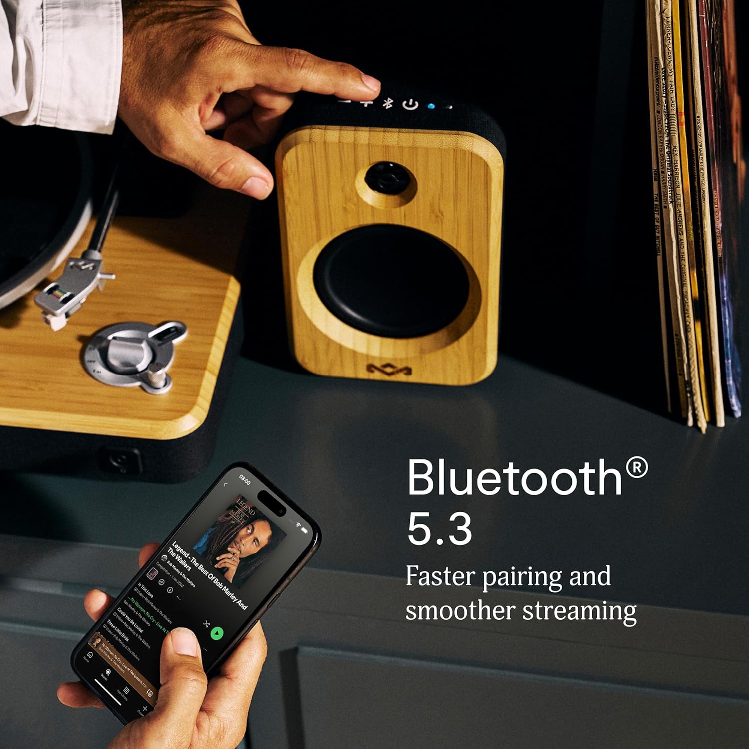 The Get Together Duo 2 Bluetooth Bookshelf Speakers bring premium stereo sound, modern design, and sustainable craftsmanship into perfect harmony. Featuring upgraded Marley Signature Sound with richer mids and deeper bass, these hybrid speakers combine a mains-powered speaker for your home setup and a battery-powered speaker with up to 25 hours of playtime for music that moves with you. Enjoy smooth, stable streaming with Bluetooth 5.3, or connect via AUX and RCA inputs for versatile listening, from vinyl to digital playlists. Crafted from renewable bamboo and REWIND fabric, the Get Together Duo 2 delivers style, sound, and sustainability in one package.