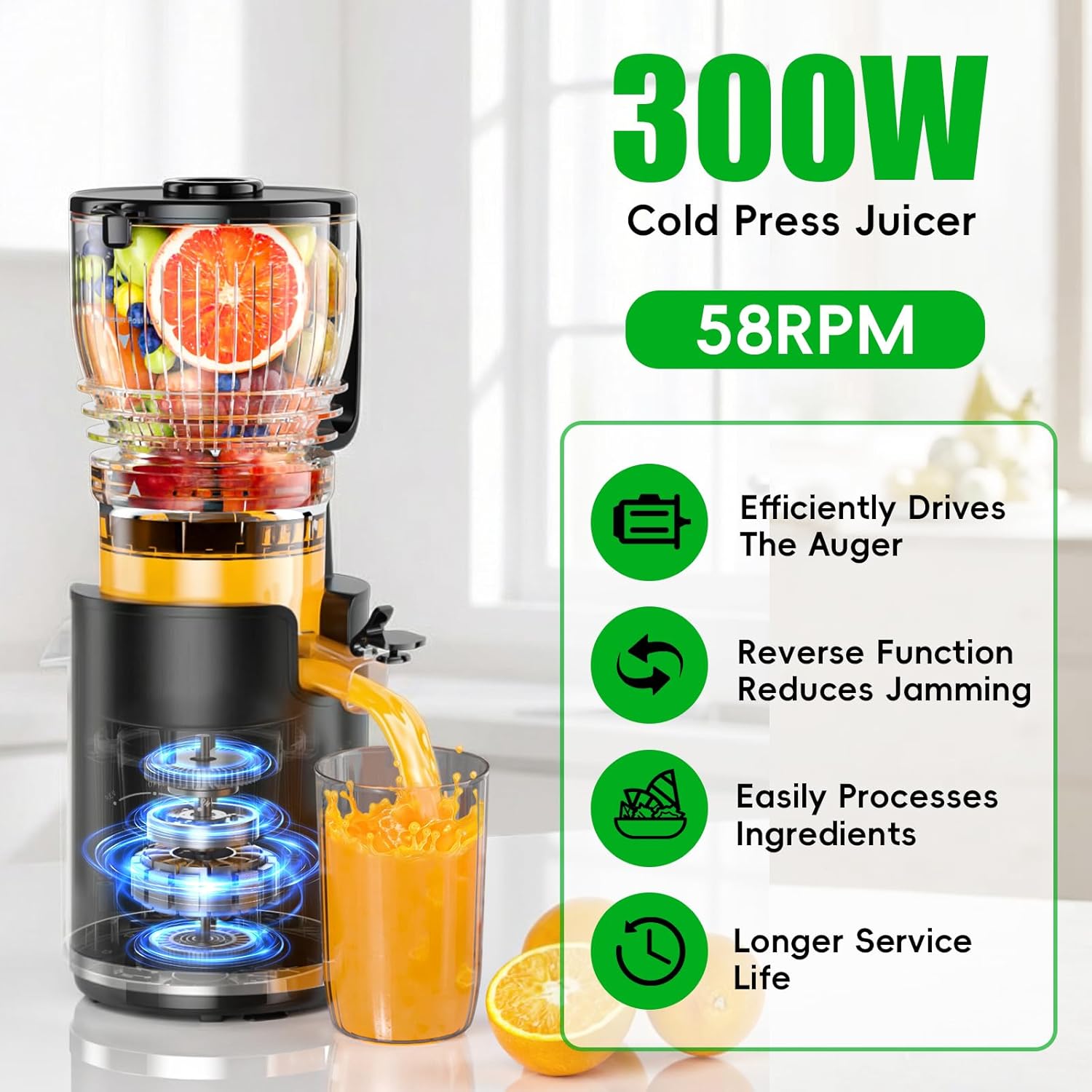 | Special Features | Easy to Clean and Disassemble, High Juice Yield, Whole Fruit Processing, Low Noise, Reverse Function, Overheat Protection, Safety Lock, Metal-Free Filter, Cold Press Technology, Anti-Clog System, Juice & Pulp Separator |