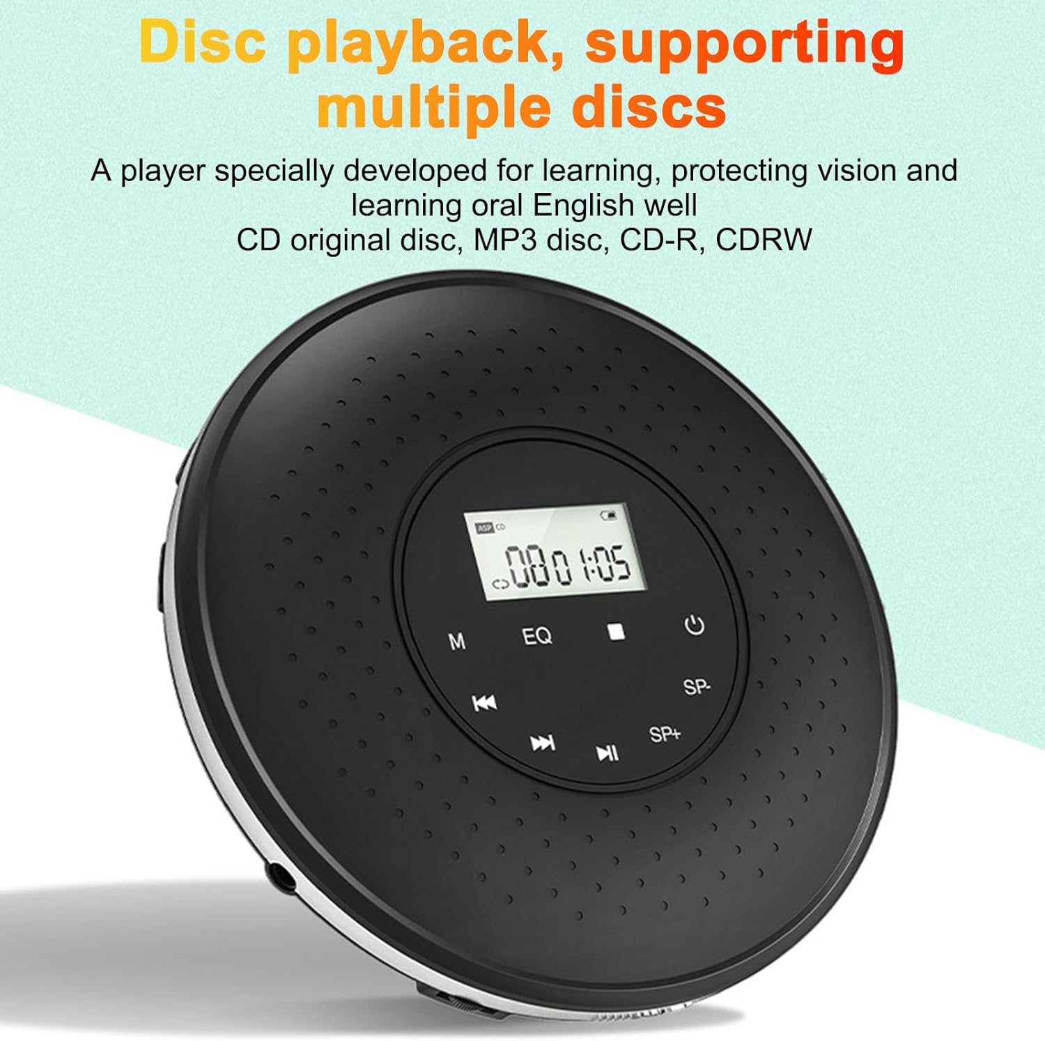 Specifications: Type: CD Player port Disc formats: CD, CD-R, CD-RW, MP3 Battery: 1000mAh Color: Black, White (Optional) Item Size: Approx. φ14.2*2.9cm/φ5.59*1.14in Item Weight: 230g/8.11oz Package Size: 17.2*17.2*4.5cm/6.77*6.77*1.77in Package Weight: 454g/16.01oz Package List: 1 * CD Player 1 * Wired Headphone 1 * 3.5mm dio Cable 1 * USB Cable 1 * User Manual