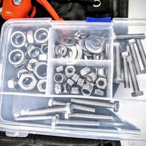 You also get a basic spares kit with flat and split washers, nuts (both hex nuts and nyloc nuts) and rigger bolts. Most common sizes are included (30mm and 40mm M6 rigger bolts, M6, M8 and M10 nuts and washers), inside a convenient transparent plastic multi-compartment case.