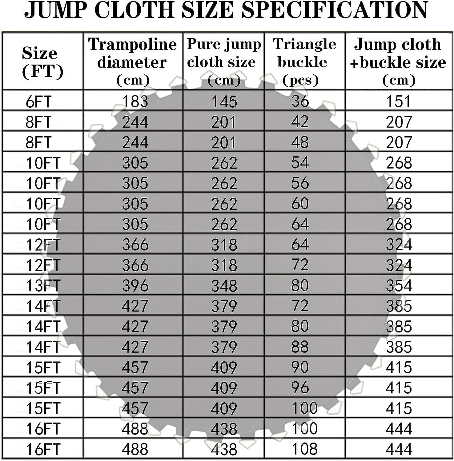 Why replacement trampoline jumping mat?With this new and strong trampoline jumping mat, the bounce of the trampoline can be restored to its original state! Provide you with the safest, lasting joy and interesting investment, it is an ideal choice to fix and install trampoline mattresses and accessories in open areas outdoors.Kind tips:You can choose the size according to your trampoline size.This is just the trampoline mattress, not its frame or the entire trampoline.Specification:Material: PPShape: roundColour: BlackSuitable for: fitness equipment, leisure, entertainmentSize (approx.): 14FT: diameter 4.27m, 80 buckles14FT: diameter 4.27m, 88 bucklesPackage include:1*Trampoline mattressNotice:1. Due to different monitors, please allow a little color difference. Please refer to the actual product.2. Please allow a slight error of 1-3 cm due to manual measurement.